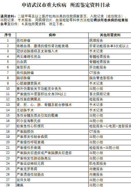 重大疾病所需鉴定资料:二级甲等及以上医疗机构出具的住院病案主页、入院记录(或住院志)、出院记录、手术报告,用病理切片、血液检验等相关资料;