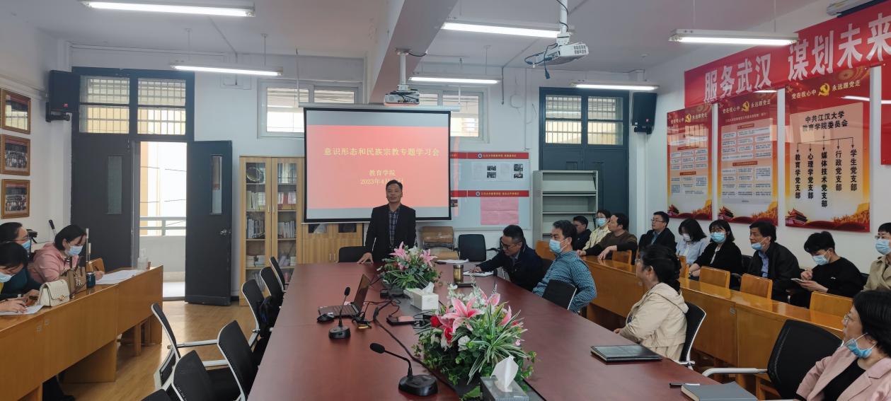 4月13日下午,污漫 在J04A413会议室开展意识形态和民族宗教工作专题学习会,会议由党委书记赵友法主持,全体教职工参加。