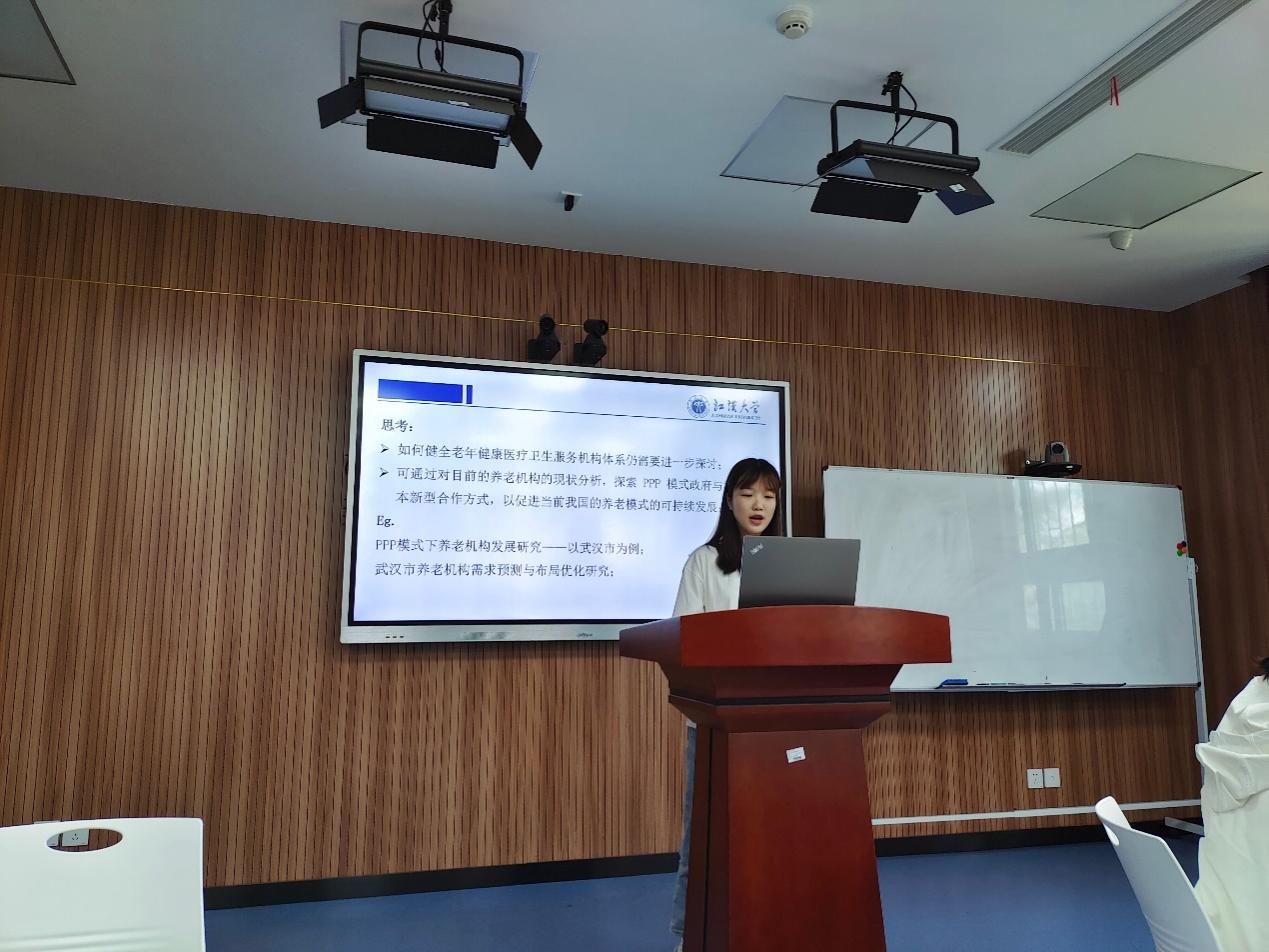 三位应用心理硕士研究生就老年心理服务管理的相关内容做了汇报,首先,硕士研究生曾莹就老年健康服务模式及医疗卫生服务机构体系建设和养老机构护理人员对老年人的态度的研究进展进行了梳理和分析,列举了影响我国老年健康服务模式的因素和养老机构护理人员对老年人态度的影响因素及干预措施,提出了对健全养老服务机构体系的PPP模式应用的可行性思考。随后,硕士研究生陈晓玥对养老护理人员的胜任素质指标体系的构建进行了讲述,介绍了相关研究现状,提出将内部动机引入胜任素质的构建。最后,硕士研究生李姣就养老机构的行业现状、盈利模式及国外经验进行梳理介绍。与会教师与学生针对汇报内容进行了讨论分析,提供了诸多宝贵意见。