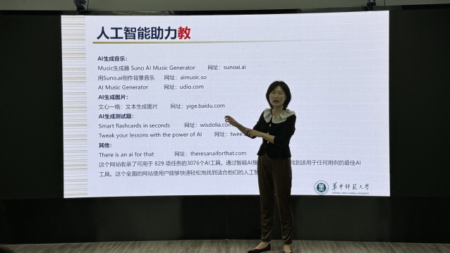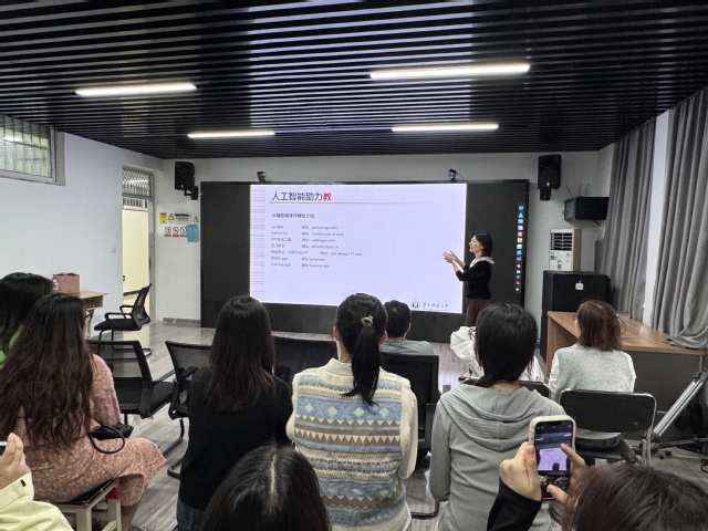 本次讲座中,闵秋莎副教授以其深厚的学术背景和丰富的研究经验,从人工智能助力教、教学资源的分享,以及人工智能辅助学习者学习情况采集等多个维度,对“人工智能助力‘教’与‘学’”进行了深入的阐述。她分享了如何利用人工智能技术优化教学内容的开发与设计,以及如何通过AI工具和平台实现文生文、文生图、文生视频作品等,实现AI赋能教育教学的创新实践。互动环节,在场师生进行了热烈讨论与沟通。闵秋莎副教授对现场提出的问题给予了耐心而详细的解答,她的观点和建议受到了在场师生的一致好评。
