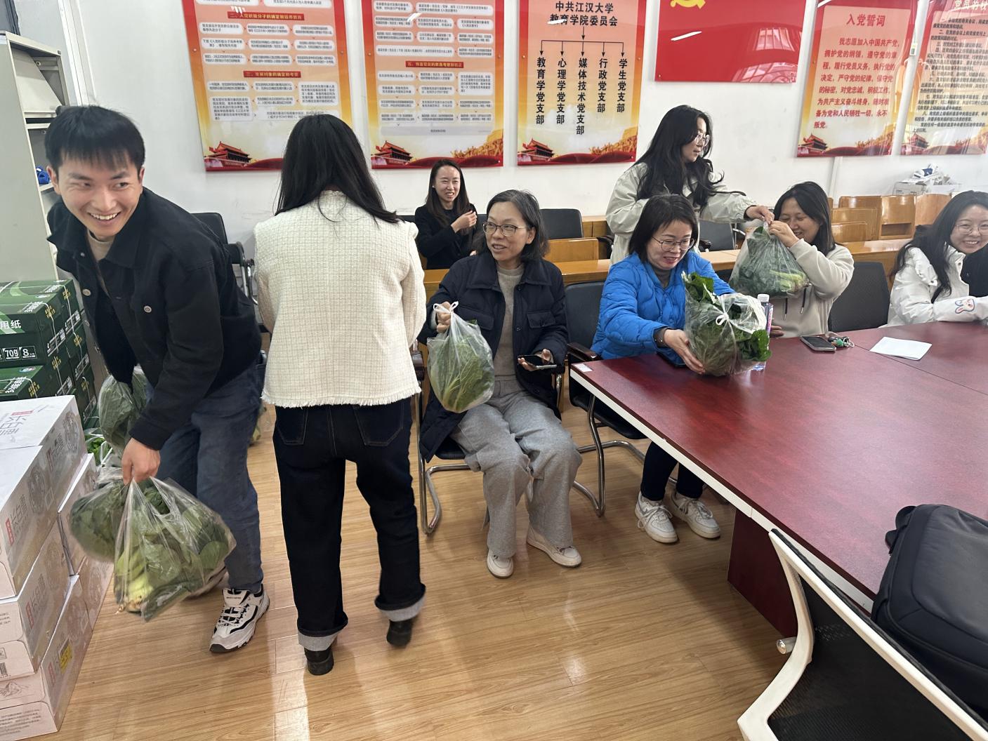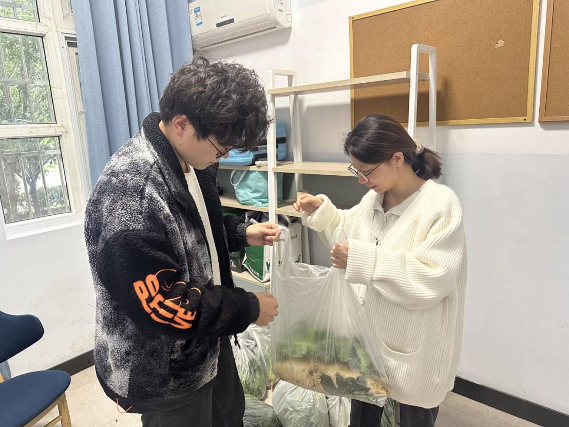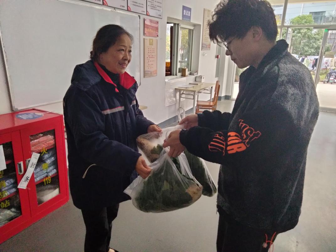 学生们还前往楼栋宿舍,将劳动成果分享给一直以来辛勤付出的宿管。“阿姨,这是我们自己种的菜,与您分享,谢谢您每天为我们值守”,真诚的话语让宿管阿姨们脸上绽放出感动的笑容。