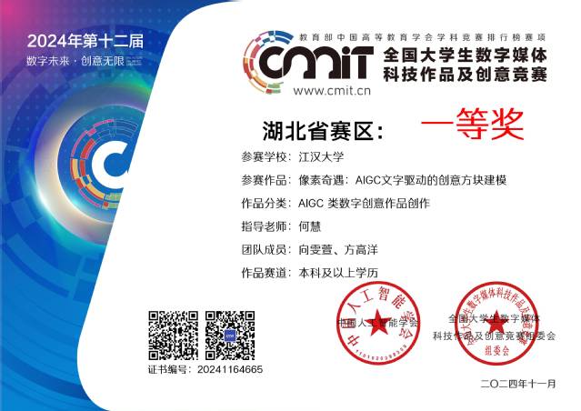 2024年11月24日,第十二届“全国大学生数字媒体科技作品及创意竞赛”全国现场总决赛圆满落幕。污漫 数字媒体技术专业学生向雯萱、方高洋凭借作品“像素奇遇:AIGC 文字驱动的创意方块”荣获全国二等奖及湖北省赛区一等奖。