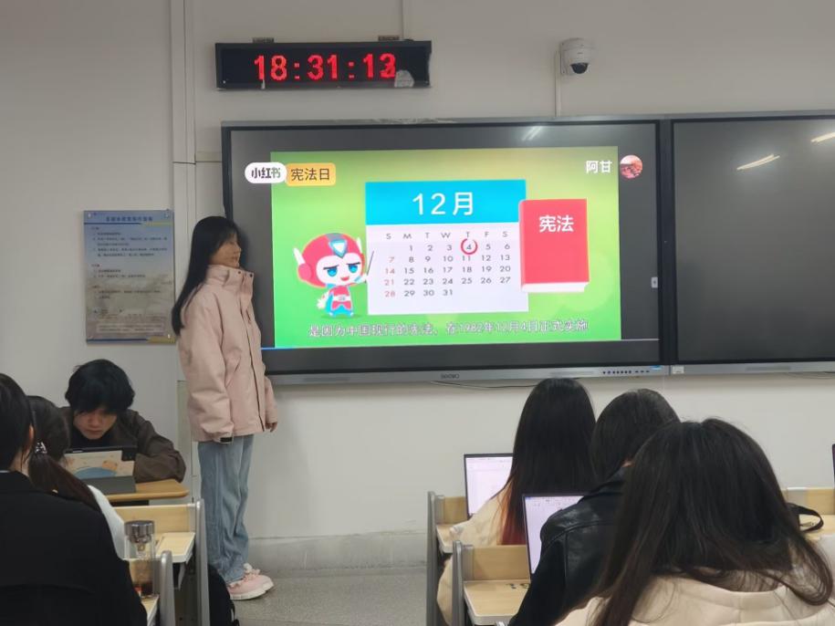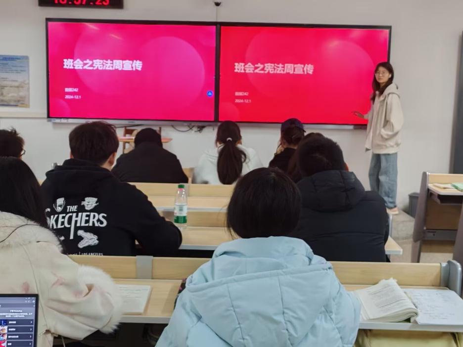 各班级通过多种形式进行宪法宣传。在班会之宪法周宣传活动中,同学们整齐坐在教室里,聆听台上同学对宪法知识的讲解,大屏幕上醒目的“班会之宪法周宣传”字样,彰显活动主题。有的班级通过展示12月日历,特别标注出宪法日,强调宪法的重要性。还有班级在教室内深入学习宪法基本概念与重要性,同学们聚精会神。有的班级则在大屏幕上呈现宪法相关条文,展开细致解读。同时,部分班级还认真研讨宪法相关主题,如“宪法——薄如蝉翼,重如泰山”宪法学习重要性讨论,营造了浓厚的宪法学习氛围。
