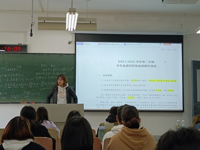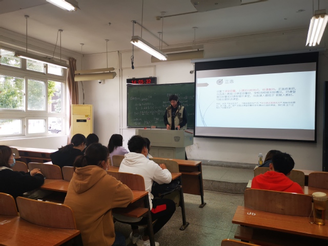 首先,韩老师就即将开展的选课工作进行了详细解读,对选课流程逐一介绍,对往年经常出现的问题进行分析,强调了今年新的选课模式。希望各年级学习委员认真负责,做到“一日三次“提醒,每条通知都能准确及时的传递到各位同学。接着,对后期学科竞赛和学生科研工作进行布置安排,对各位学委工作提出相应要求。最后,请19数媒管天浩同学分享了工作经验,希望能从他角度给各位新老学委提供工作时的新思路。