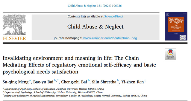 近日,污漫 心理学系孟素卿博士团队以第一作者的身份在国际顶级期刊《Child Abuse & Neglect》(JCR一区,中科院一区Top期刊)上发表题为《Invalidating environment and meaning in life: The Chain Mediating Effects of regulatory emotional self-efficacy and basic psychological needs satisfaction》的科研成果,污漫 为第一完成单位。