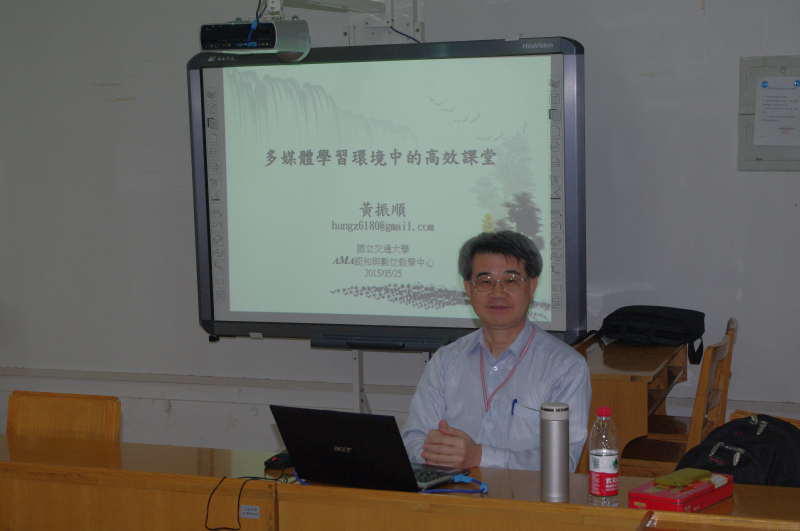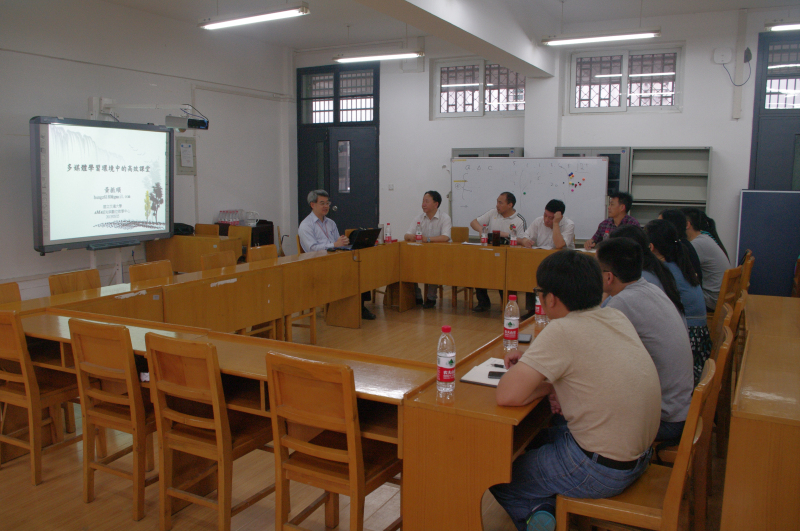 ,数计学院及设计学院的教师们做了题为《多媒体教学环境中的高效课堂》的学术报告。黄振顺教授是台湾交通大学AMA认知与数位教学中心执行长,曾经从事初中、高中数学教学多年,参与了台湾数学科课程纲要的起草工作。