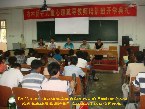随着社会经济的发展,越来越多的农村富余劳动力进城务工,随之而产生的农村留守儿童问题也日益突出,而他们的心理健康也亟待得到关注与解决。武汉市教 育局高度关注这一问题,针对留守儿童亲情缺慰、心理缺疏的情况,特组织本次培训班,旨在使武汉近郊中小学教师能够更深入地去观察、体会留守儿童心理,并能 及时对他们进行心理疏导,从而提高全市学校的心理疏导能力。本次培训内容涉及到对武汉市学校心理健康状况的介绍,以及农村留守儿童的学习辅导、情绪辅导、 人际关系辅导等。其中心理体验活动是这次培训的一大亮点,这是一门适宜在学校进行的心理辅导的理论与实际操作课程,通过玩“模仿秀”、“大风吹起来”, “各自找家”等活动,使众教师深切感受到人与人之间的团结、信任,并能把这传达给学生。现场气氛热烈,笑声连连,取得了很好的效果。