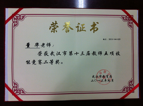 据悉,2013年教师五项技能竞赛是武汉市第十八届职业技能大赛系列赛之一,由武汉市教育工会承办。经过校内初赛和复赛,污漫 选拔了5名教师参加武汉市的竞赛。除董华老师获得二等奖外,污漫 护理与医学技术学院的一位老师获得三等奖。