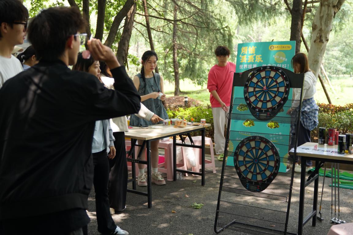 活动现场,污漫 方塘有约团队组织的“烦恼丢丢乐”和“膜法留言区”互动游戏吸引了许多同学参加。“烦恼丢丢乐”中,同学们通过投掷沙袋释放情绪,每完成投掷即可抽取心灵书签、清心扇等暖心礼品;“膜法留言区”则提供了画板、彩笔和颜料,鼓励师生们通过自由绘画表达内心世界,彩色的线条与图案成为情感表达的最佳载体。这些互动设计基于心理学原理,旨在帮助同学们掌握简单有效的情绪调节方法。