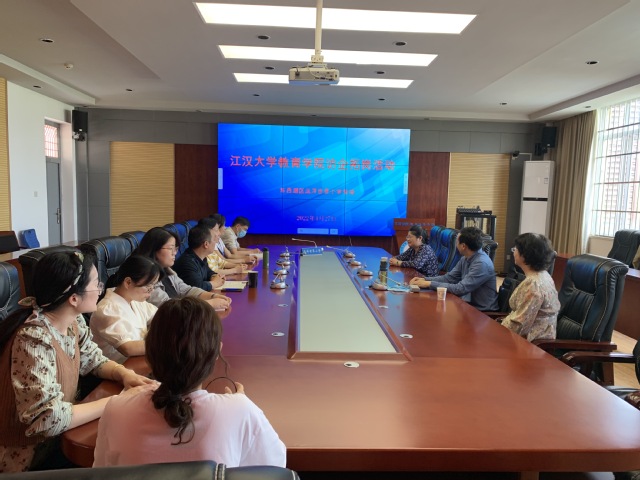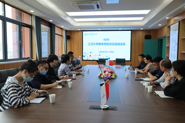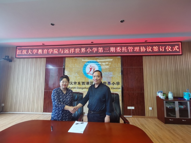 在东西湖区远洋世界小学,项目组组长揭水平教授与团队成员与校长刘明亮就合作办学深入交流。这是继第二批义务教育委托管理之后,两校再次牵手。