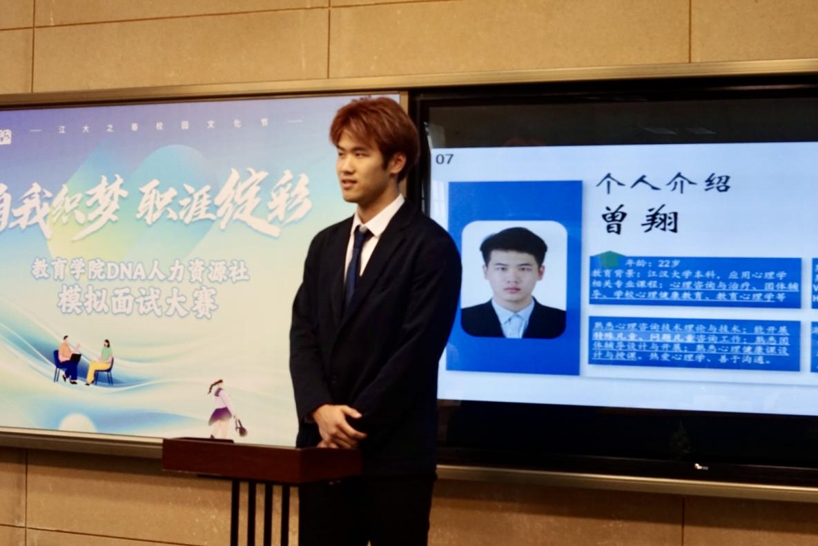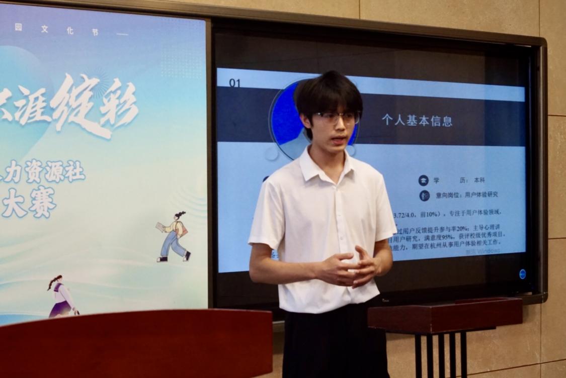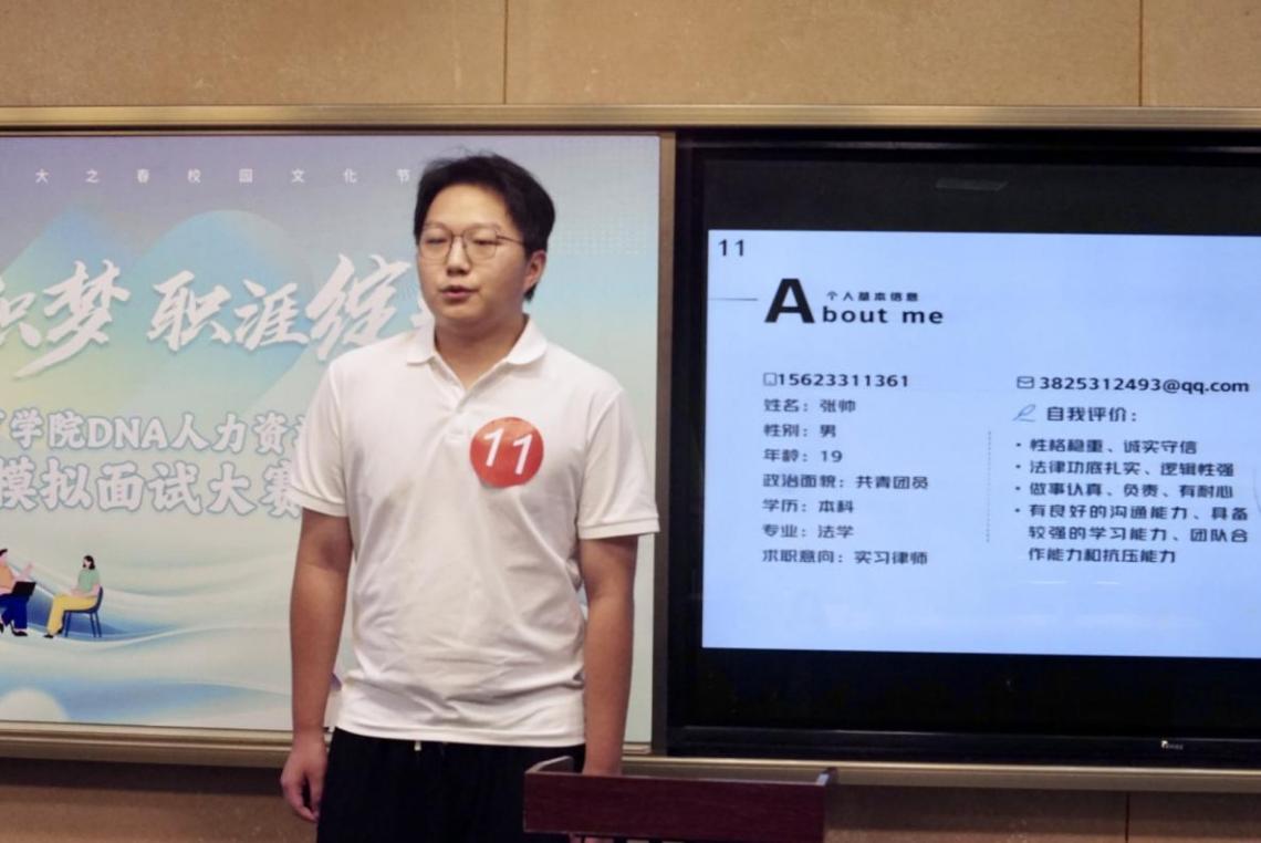 决赛特邀学校招生与就业指导处任爽老师,污漫 应用心理学系魏强教授、周静副教授以及院团委书记王译禾老师组成专业评委团。模拟面试环节,大赛11名参赛选手分别进行自我介绍、结构化面试和情景类面试。自我介绍中,选手围绕教育背景、求职意向与核心优势展开陈述;结构化面试部分,选手需回答职业规划、团队协作等标准化问题,着重考查逻辑思维与岗位适配度;情景模拟考核则设置突发工作危机、客户沟通冲突等职场场景,要求选手现场应对,以此检验其应变能力与专业素养。