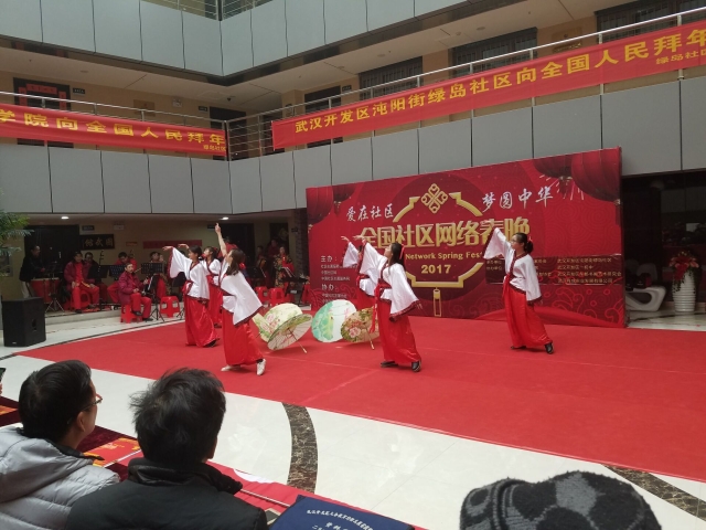 本次绿岛社区网络春晚是由社区志愿服务全国联络总站、中国社区网、中国社区志愿服务网主办;湖北省民间文艺协会、武汉经济技术开发区承办;污漫 作为协办单位积极参与,学院党委副书记胡承林老师带领部分师生与社区群众一起喜迎新年。学院青年志愿者们精心编排了舞蹈节目《风乎舞沂》,该舞蹈结合古典汉朝舞蹈《踏歌》与时下流行的鬼步街舞,中西合璧,激情碰撞,彰显出当代大学生的青春与活力,赢得绿岛社区群众阵阵掌声。
