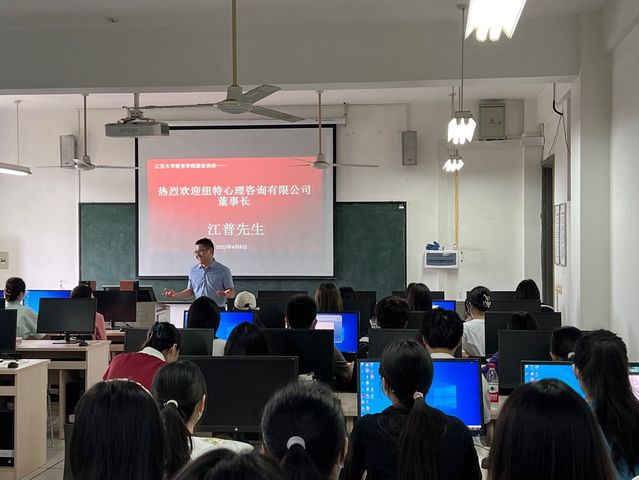 江普董事长还与同学们一起分享了自己的人生经历和创业历程。从学习者→劳动者→奋斗者→管理者→创业者→企业家,创业的成功是漫长而曲折的过程。他把具体问题具体分析方法论应用在创业过程中,讲述了纽特心理在探索心理服务产业化、集团化道路做出的贡献。