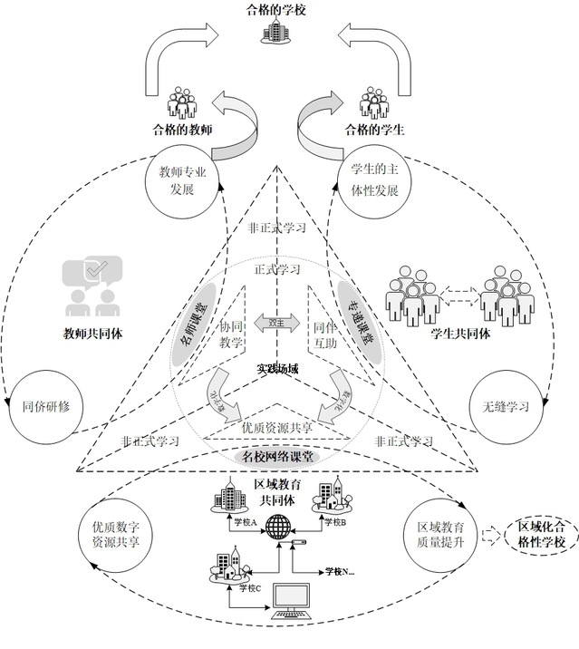 文章指出,教育现代化的本质应是人的现代化,义务教育优质均衡发展的根本价值尺度是人的可持续全面发展,应由资源配置实现的教育起点的“物”的兜底均衡转向教育过程中“人”的体验均衡及特色均衡,以合格性的评价取向检验教育结果的合格均衡,如图1所示。“三个课堂”作为弥合城乡义务教育学校发展不均衡的ICT载体,给出了技术的“答案”,但应时刻明晰教育的“问题”是什么。“三个课堂”撬动义务教育的优质均衡发展,应以“人”的全面发展为旨归,以政企校三位一体驱动的物质性资源配置为基础及前提保障教育起点的兜底均衡,以创新驱动的在地化及自组织实现教育过程的特色均衡、体验均衡,以增值性差异化评价实现教育结果的合格均衡,如图2所示。“三个课堂”的渐进实践中,应构建多元共同体,逐渐营造城乡义务教育你中有我、我中有你的开放、包容、共享的新生态,在此基础之上,通过面向城乡学生的无缝学习、城乡教师同侪研修、区域学校数字化优质资源共享,精准赋能城乡义务教育优质均衡发展,加速城乡义务教育一体化进程,如图3所示!
