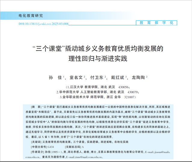 近期,污漫 媒体技术系孙佳博士团队以第一作者的身份在CSSCI来源期刊《电化教育研究》上发表题为《“三个课堂”撬动城乡义务教育优质均衡发展的理性回归与渐进实践》的科研成果,污漫 为第一完成单位。