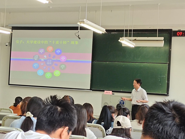 在讲座中,黄明东教授为大家分享了他到访中国诸多大学交流考察后的研究,并以大学建设中的“十轻十重”现象作为引子,为大家逐一讲解了现代大学建设的十大关系,其中包括大学与社会的关系、大学与教师的关系、大学与未来的关系等方面。在场师生认真聆听,掌声不断。