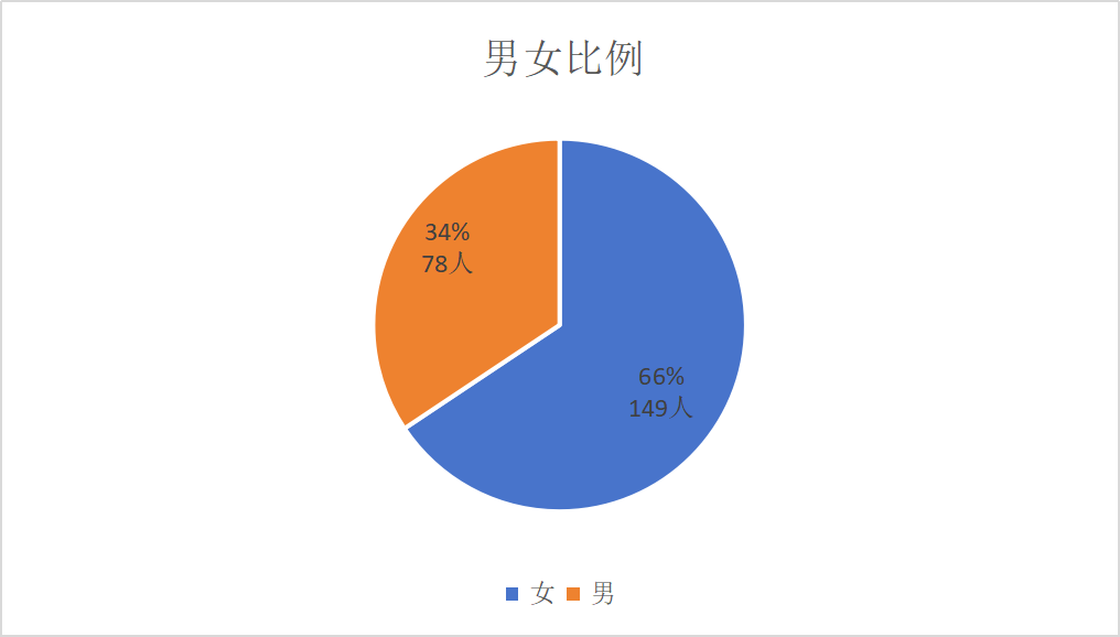 227位教院新生中,男同学78人,女同学149人,男女比例为1:1.91。不同性别的同学带着各自的特质与潜力相聚江大教院,未来必将在课堂学习、实践探索与校园生活中相互赋能。