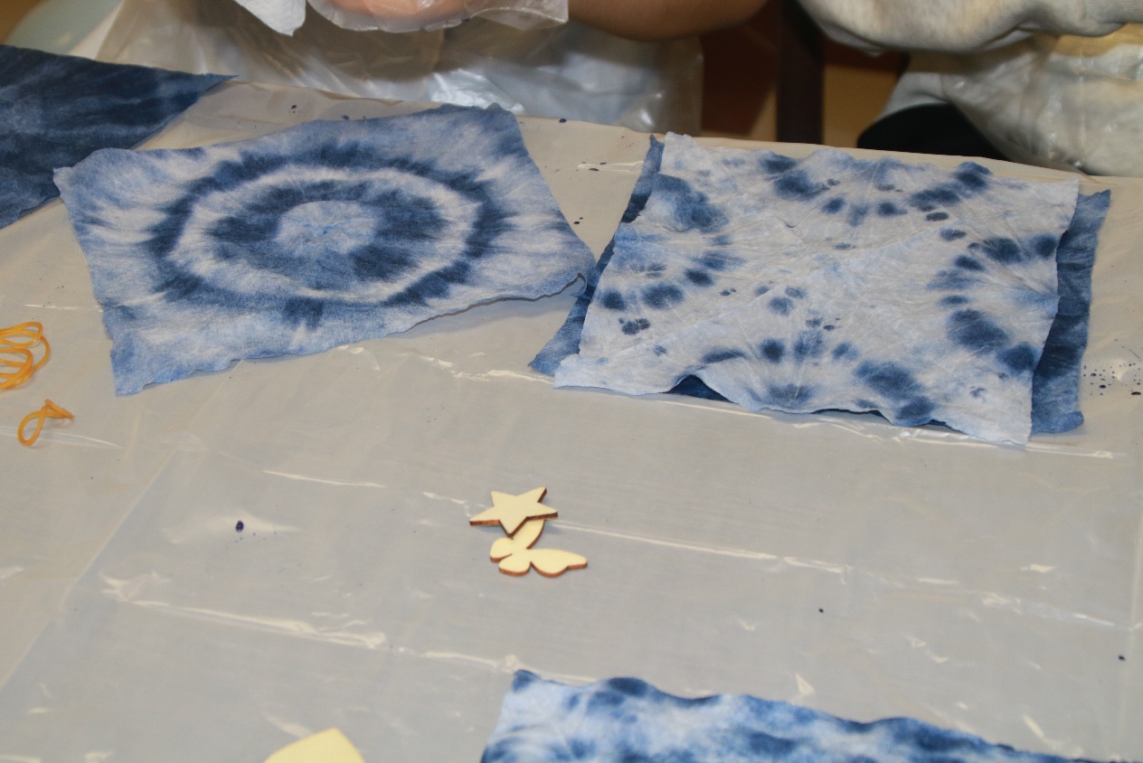 来自苗族的同学向大家介绍了蜡染、扎染的历史渊源与文化价值,并通过视频演示传授扎染技巧。现场,各民族同学以扎染技艺为纽带,在折叠、绑扎、浸染等工序中搭建起交流共融的桥梁。每一道手工工序都是对民族传统文化的生动礼赞 —— 方巾经折叠绑扎后浸入染剂,待清水冲洗、晾干,图案随染料渗透自然绽放,或似山水晕染,或如花鸟灵动,件件作品各有千秋。实践中,同学们不仅掌握了扎染技艺,更在合作中加深了彼此情谊,真切感受各民族文化的独特魅力,进一步强化了民族文化认同感。