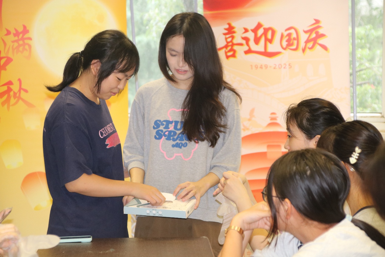 海上生明月,天涯共此时。揉一团软面,裹满对亲人的牵挂捏一枚月饼,藏尽同窗的温情。同学们化身“手作达人”,从筛粉、调馅到压模、烘焙,每一步都满含心意,只愿尝到一口专属的香甜,把团圆的味道记在心里,在实践中感受着传统饮食文化与民族元素的结合。汉族的糖桂花、蒙古族奶豆腐、西藏的酥油茶等民族传统小吃也同学们争相品尝,浓郁的民族风情在此刻碰撞交融,既唤醒了大家对家乡家人的思念,更让 “民族团结一家亲” 的理念悄然扎根。