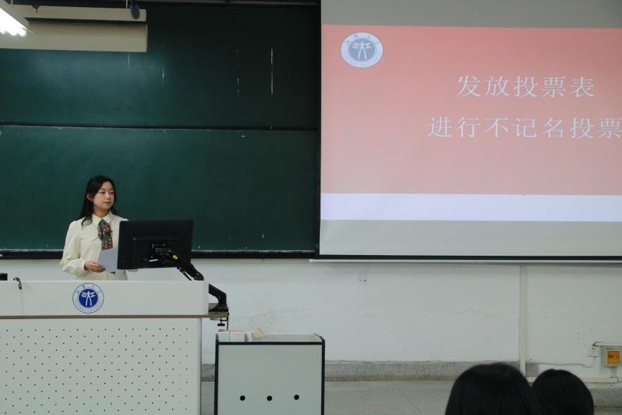 随后,由主持人宣读投票规则,并向学生代表们详细解读了代表人入选的条件和标准。在她逐一介绍完10名候选人履历后,由学生代表对各代表候选人投票。本次投票由学生会秘书长王娇监票,其余三名计票人员统计票数,保证投票过程及结果公平、公正、公开。