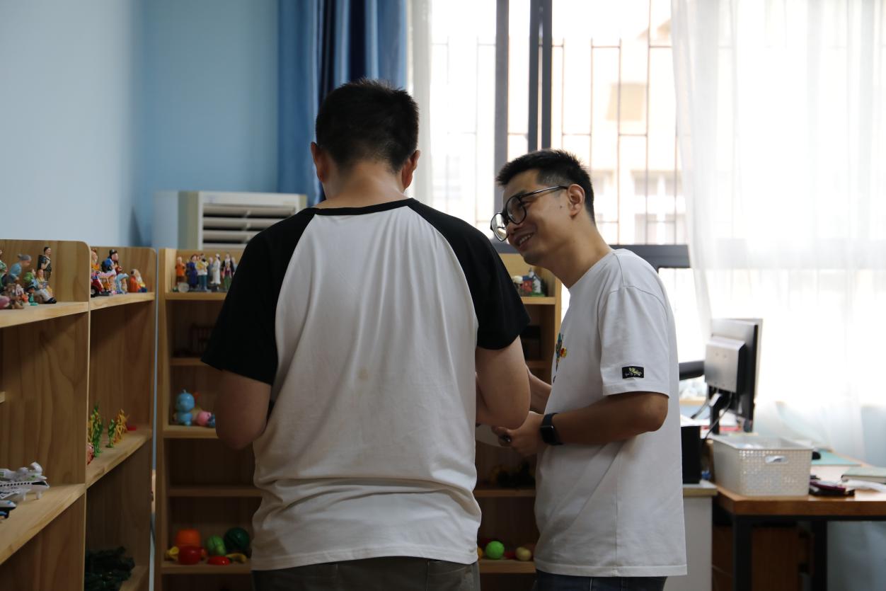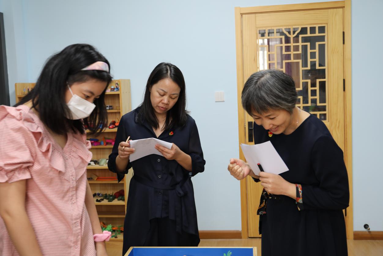 第二部分是专业的心理沙盘游戏,在心理沙盘室开展。这是一种象征性游戏治疗手段,在游戏过程中,参与者通过触摸和移动沙子、摆放沙盘模具的过程,释放情绪压力。而多人参与的团体沙盘游戏,还能够营造一种被爱、被关注和被包容的和谐氛围,使参与者感受到与人交流的乐趣, 促进沟通能力的发展,提升社交能力,从而逐步从自我封闭的世界中走出来。在心理系具有丰富沙盘理论与实践经验的孙远副教授、余香莲副教授和高超博士,党员代表陈继文、孟素卿、董华、陈丹文,党外青年教师蔡爽爽共同参与下,让孩子们体验到活动的魅力。专家们充分尊重孩子们的意愿和感受,给予孩子们细致入微的照顾,使每一个孩子都有丰富且各具特色的沙盘呈现。