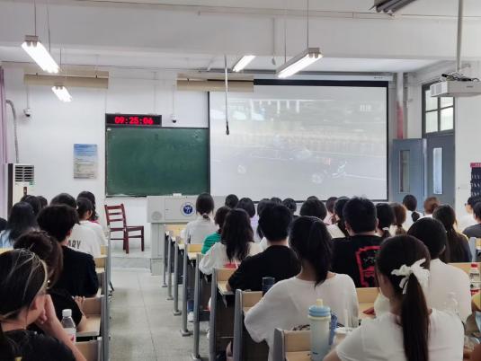 活动现场,随着80响礼炮划破长空,阅兵式影像缓缓展开,新生们全神贯注,目光紧紧锁定屏幕。当徒步方队迈着铿锵有力的步伐通过天安门广场,整齐的队列、昂扬的斗志展现出人民军队的过硬作风;装备方队中,新型无人机、先进装甲装备等依次亮相,彰显我国国防实力的跨越式发展;空中梯队呼啸而过,留下一道道绚丽航迹—— 这一幕幕画面,让让在场新生深刻感受到国家的强大与威严,进一步坚定了“以青春之我报青春之国”的信念。大家更清晰地认识到,作为新时代青年,应当以先辈精神为指引,把个人理想融入国家发展大局,用脚踏实地的奋斗与担当,书写属于自己的青春答卷。