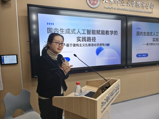 郭东坡博士汇报的主题是《国内生成式人工智能赋能教学的实践路径》,从建构主义理论视角对国内生成式人工智能赋能教学的案例进行了质性分析实践。