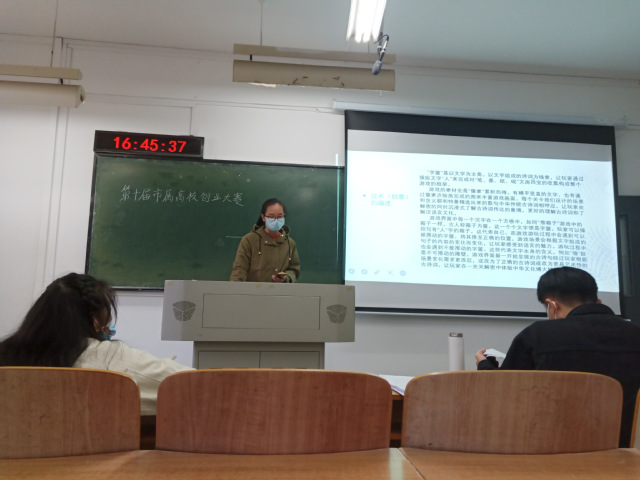 此次大赛污漫 共有十个小组参赛,在主持人宣布比赛开始后,每个小组便依次上台答辩,现场井然有序,,在所有小组答辩完毕后,现场评委老师从团队情况、创新性、商业性等各个方面进行了打分,并给参赛选手提出修改意见,让参赛选手受益匪浅。