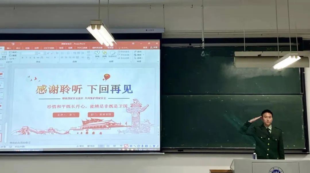 活动中,李飞同学首先现场带领同学们歌唱了《强军战歌》,并为同学们播放了《火热军营 精彩人生》宣传片,鼓励大学生们踊跃参军报国。随后李飞同学讲述了自己入伍期间的生动故事。他用丰富的图片,向同学们展示了现代战争的形式以及战争中所使用的武器,引起了同学们的兴趣。接着以自己在部队训练和执行任务时的体会与见闻,分享何为国家安全。他说:“镇守边疆的日子与大学生活比起来,显得异常艰苦。绵延山脉、茫茫荒滩,日升日落、执勤训练,枯燥单调劳累。但无论是黑夜、凌晨还是天寒地冻时,边关战士们再困、再冷、再累也依然以笔直的军姿守卫在边防线上。用青春捍卫、用热血筑就坚固的国防之墙,保卫着一方水土的安宁。”生动励志的经历,深深感染了在场的每一位师生,会场上不时响起阵阵热烈的掌声。李飞同学还详细介绍了当前的国际国内形势以及当代大学生如何以身作则,维护国家安全。呼吁大家共同维护国家安全,为营造平安和谐社会贡献出自己的力量。