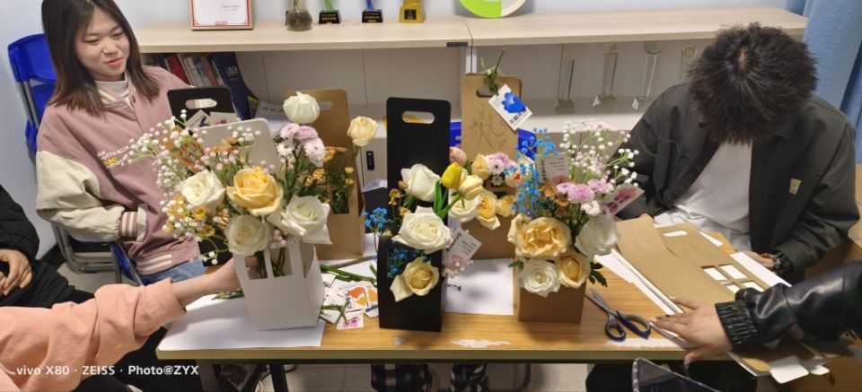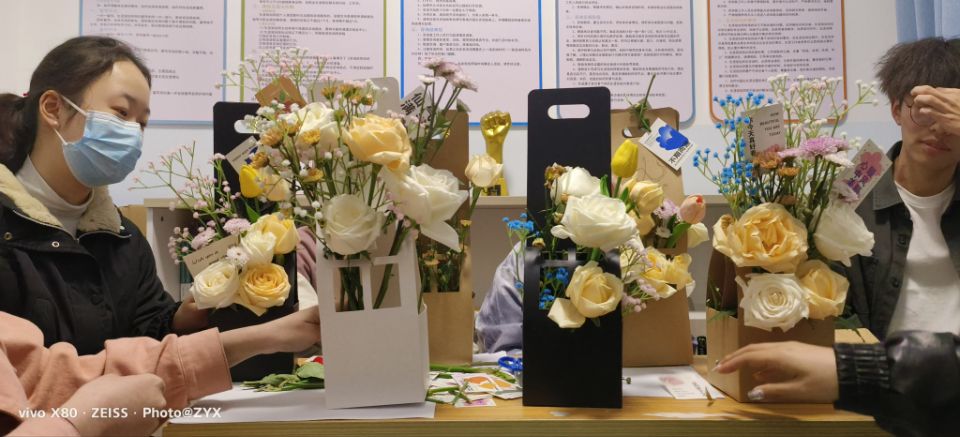 各年级的同学,在解压小屋工作人员的带领下,通过“你画我猜”等小游戏互相熟悉,逐渐融化彼此间陌生的坚冰。“破冰”之后,大家便迫不及待地行动起来,将春日的馥郁芬芳与心中的愉悦宁静一并插进各色花篮中。一件件别出心裁的插花作品在同学们的桌前渐渐呈现,同学们眉眼间的疲惫与紧蹙也一点点在快活热闹的气氛里被慢慢抹平,编织成对未来彩霞般的向往。活动中,大家敞开心扉,积极交流合作,在将浓丽娇艳的柔嫩花朵插绕搭配在一起时,也把心中积郁的愁闷一并挥洒,重新获得心灵的舒缓与放松。春正好,但见花不老、点火樱桃,韶华如昼,共聚一堂,心幡动。