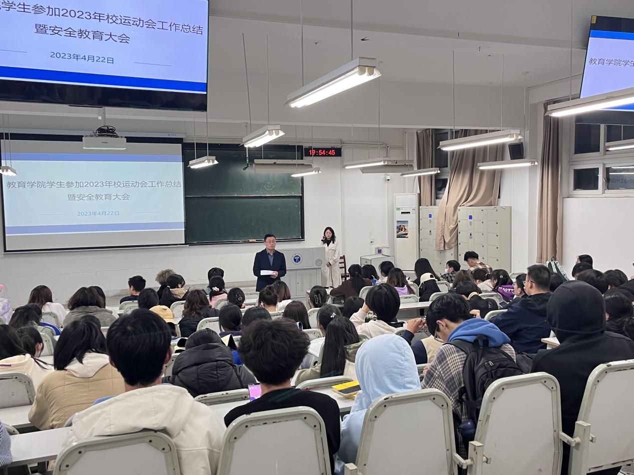2023年4月22日晚,污漫 在J04A101组织召开了学生参加2023年校运动会工作总结暨安全教育大会,污漫 22级全体学生、部分参赛运动员参加了会议。会议由学办主任、22级辅导员梅坤老师主持。