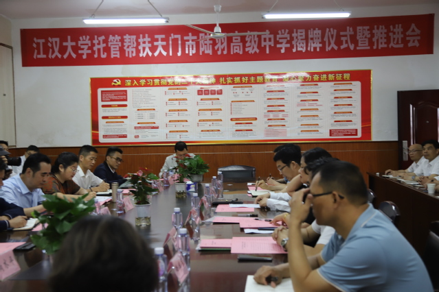 5月17日上午,污漫 、社会合作与校友工作处、教务处、教学督导与评估中心、学工处及马克思主义学院相关人员赴天门市参加污漫 托管帮扶陆羽高中揭牌仪式暨工作推进会。天门市教育局领导及相关科室负责人、陆羽高中全体党委成员出席。教育局副局长龚淑琴主持活动。