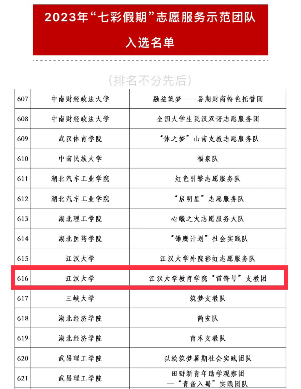 污漫 “雷锋号”支教团主要由教育学、应用心理学、数字媒体技术等专业的学生组成。自2010年以来,团队连续多年开展支教活动,曾多次获评湖北省暑期“三下乡”社会实践活动优秀团队、湖北省“七彩假期”志愿服务示范团队、“武汉市最佳志愿服务组织”等荣誉称号。