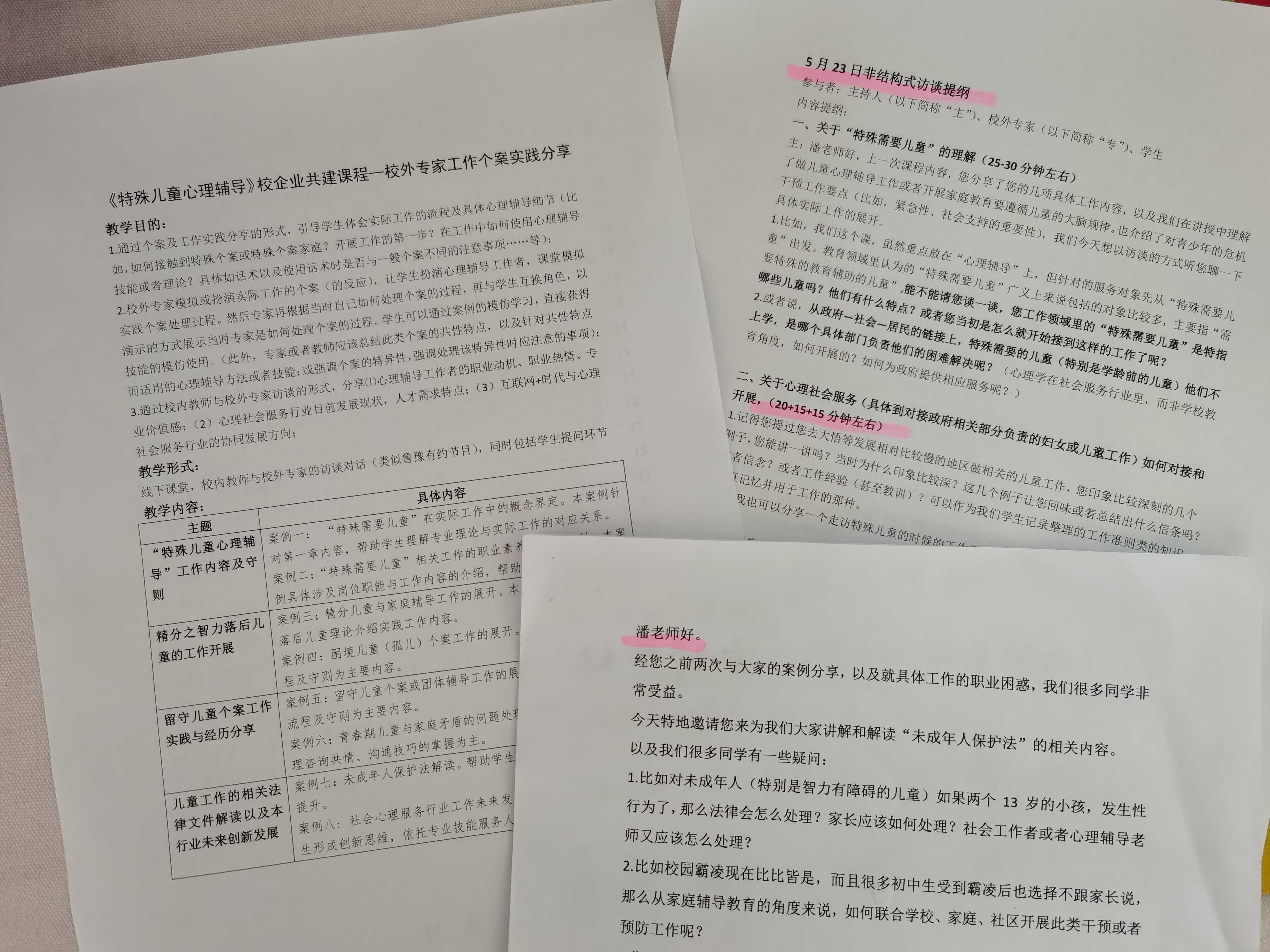 本学期开始前,课程团队结合人才培养目标以及国家和社会发展战略需求,落实污漫 “校企共建课程”教学理念和“双师”型育人模式,聘请武汉市东西湖区予童社会工作服务中心理事人潘兰女士(中国妇女十二大代表、中国家庭教育学会家校社专委会委员、湖北省家庭教育研究会副秘书长)作为课程校外专家教授,用实际工作近20年的个案内容为学生开启别样学习,受到学生热烈欢迎。