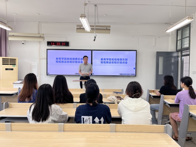 培训会上,谢雨薇老师介绍了啦啦操运动的起源、种类以及作用,啦啦操是一项深受广大群众喜爱的、普及性极强的体育运动,它集体操、舞蹈、音乐、健身等于一体,具有很强的观赏性和健身性,同时能够锻炼和激发团队合作、奋发向上的力量。她希望同学们在以后啦啦操运动中,刻苦训练,积极展现新时代大学生团结协作、拼搏向上的精神风貌。