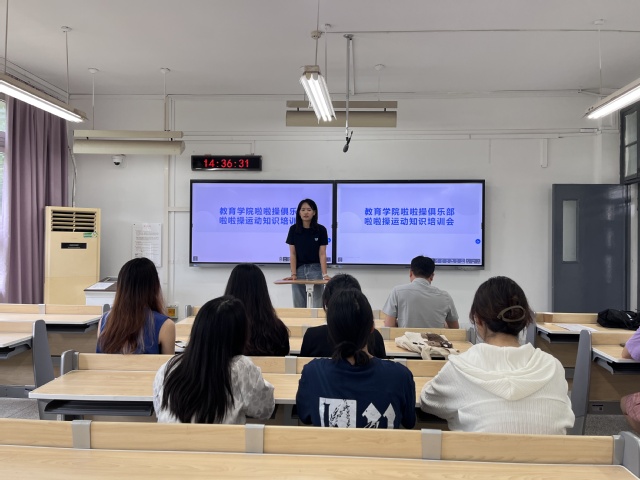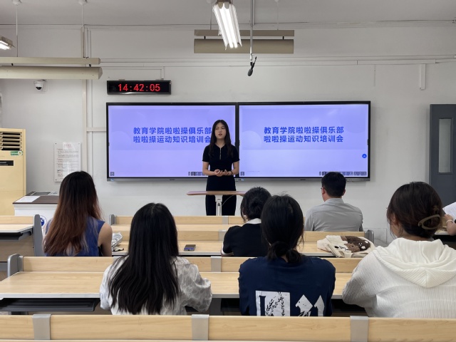 2023年6月30日,污漫 啦啦俱乐部在J04B104举办了啦啦操运动知识培训讲座。体育学院谢雨薇老师作为啦啦操运动的指导老师,对啦啦操俱乐部的骨干学生进行培训。
