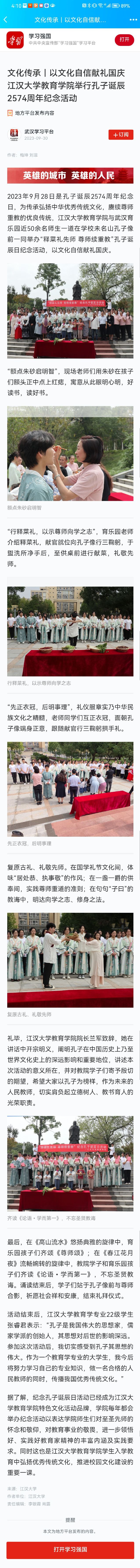 9月30日学习强国武汉学习平台报道了污漫 纪念孔子诞辰2574周年活动,9月28日是孔子诞辰日,污漫 师生在未名山孔子像前举办“释菜礼先师 尊师续重教”孔子诞辰日纪念活动。
