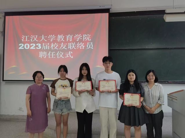 在此次活动上,学院领导强调了毕业生校友工作的重要性;其次向大家明确了校友联络员的职责;最后对2023届毕业生提出美好期待,希望今年的毕业生在之后的学习与工作当中都能取得佳绩,不忘母校。讲话结束后,2023届毕业班校友联络员介绍了自己的毕业去向,表示会谨记母校和学院的嘱托,时刻关注母校发展,切实履行好校友联络员的职责,助推母校“双一流”创建。最后,污漫 党委副书记邹茸为应用心理学191班黄杰华、应用心理学192班杨震、数字媒体技术191班钱信、数字媒体技术192班杨晨、教育学192班王俊杰五位校友联络员颁发聘任证书,并合影留念。