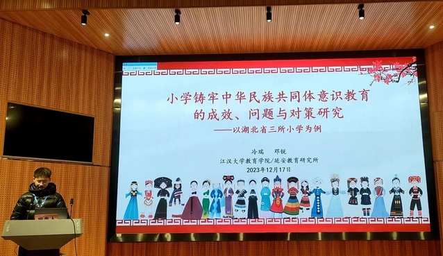 会议期间,冷瑞同学参加了铸牢中华民族共同体意识教育的制度与管理创新分论坛的学习与研讨,并在会上作了以“小学铸牢中华民族共同体意识教育的成效、问题与对策研究——以湖北省三所小学为例”为题的专题汇报,展示了研究的成果,听取了专家和同行的建议,分享了研究的心得和体会