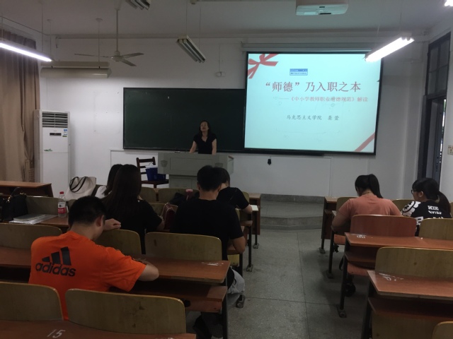 2018年6月28日下午,污漫 组织2017级教育硕士参加师德讲座,并特邀马克思主义学院龚萱教授主讲。讲座围绕《中小学教师职业道德规范》中的爱国守法、爱岗敬业、关爱学生、教书育人、为人师表、终身学习这六条师德要求规范具体展开。龚教授用风趣的语言和实际案例帮助同学们更清晰的认识到每条师德规范的内容和条文的解读,并且就关于教师的社会热点事件与同学展开了交流和讨论。同学们在讲座中都非常认真的听讲,记笔记,与老师交流互动也非常积极。通过这次师德讲座,同学们收获颇多,对于师德规范不再停于文字表面,而是有了更深层次的理解和认识,对于今后从事教师这一职业也具有指导意义。