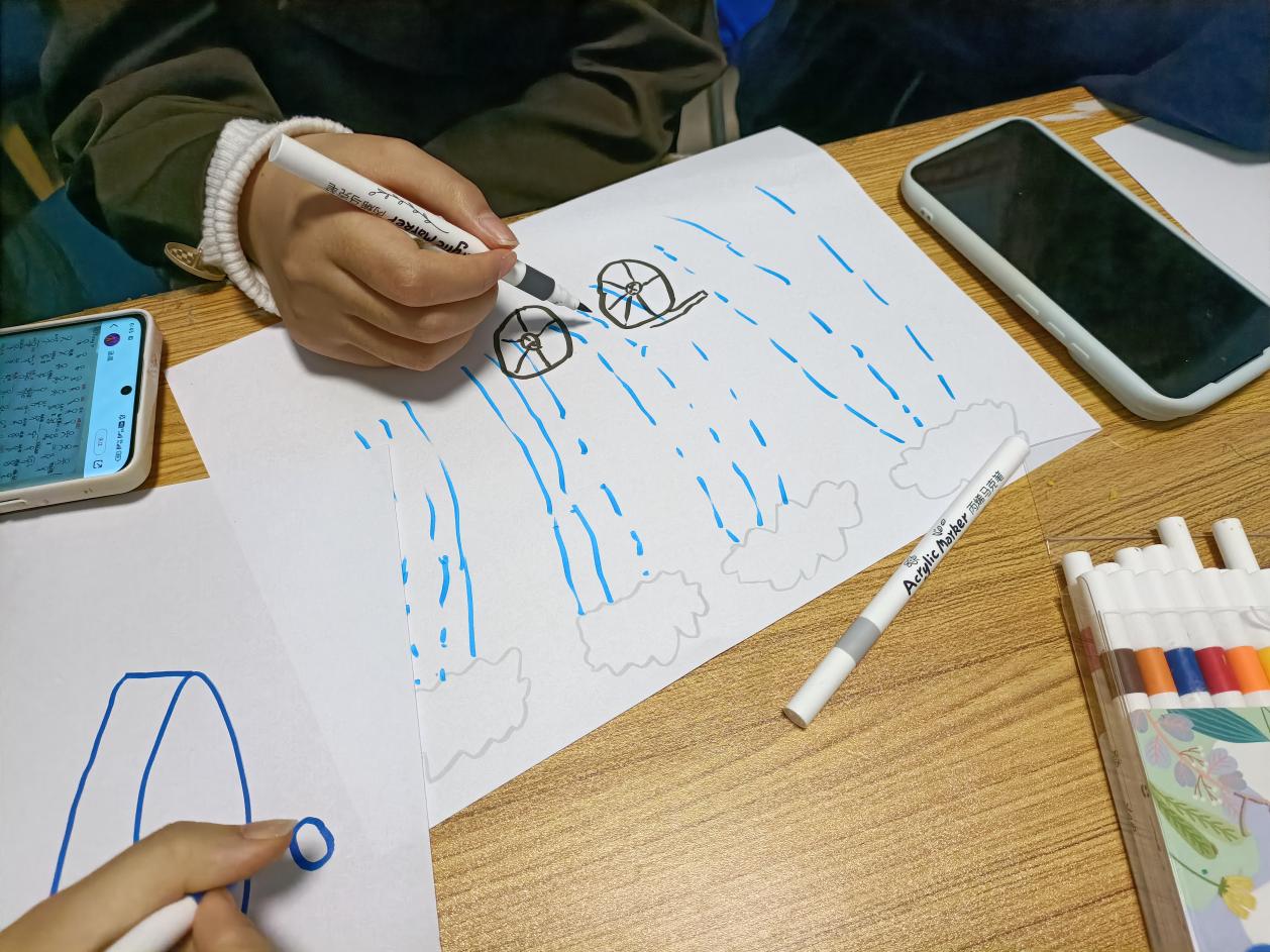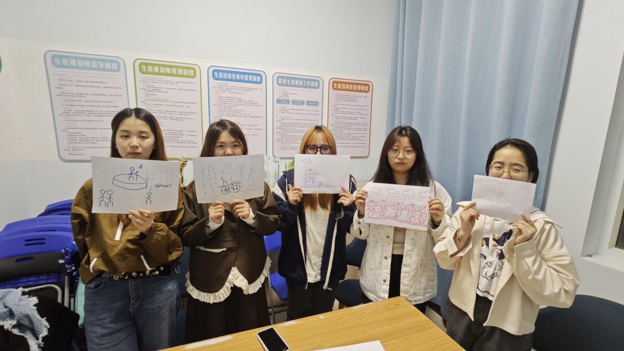 经历与内心的自己对话后,同学们纷纷拿起画笔,开始“描绘心雨,拨云见日”环节,用色彩描绘出自己心中的雨季和心愿。一幅幅生动的作品在画纸上绽放,表达了同学们对美好未来的向往和追求。这些画作不仅展现了同学们的才华与创意,更传递出积极向上的精神力量。