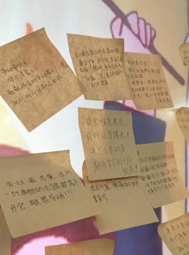 观影结束后大家在工作人员的指示下,完成便笺寄语的环节。寄语可以是对劳动节的理解、感受,或是对影片的感想、对劳动人民的赞美等等。便笺寄语传递了同学们对劳动品质更为深刻与具体的感受,代表了同学们对劳动人民美好的祝愿与感谢。便笺寄语活动进一步树立和培养了学生的劳动意识,理解劳动光荣,劳动出彩的深刻内涵。