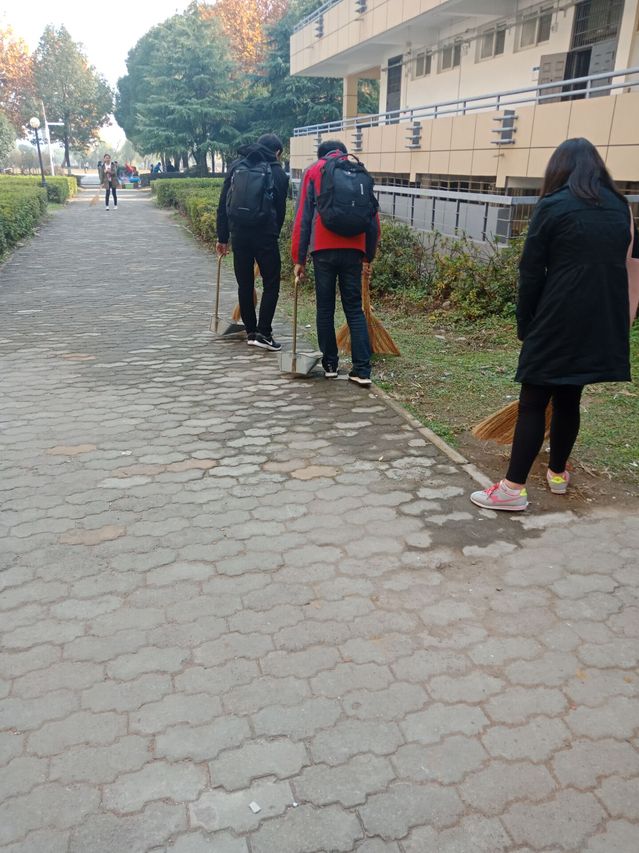 每次活动都在中午时分,志愿者们领完劳动工具后便出发去目的地进行卫生打扫,志愿者们除了处理污漫 教学楼的垃圾外,还对J07、J08、J09、J10四所教学楼进行打扫,不管是炎炎烈日下,还是寒风凛冽下,志愿专业和们依然辛勤劳动,凭借着不怕苦不怕累的奉献精神进一步将校园变得更加整洁干净。志愿者们不放过任何一个角落,角落的垃圾打扫起来并不轻松,大多时候志愿者们都无法用工具将其清扫出来,于是我们没有任何迟疑的弯下腰,或是钻入草丛之中,或是走到路旁缝隙,用手将垃圾拾起。