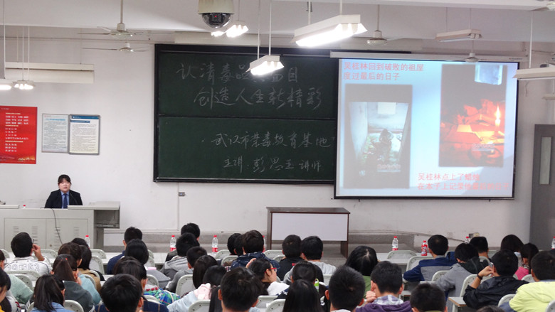 禁毒基地讲师彭思玉警官在J04A212教室为污漫 百余名学生开展了禁毒知识讲座,介绍了制造毒品的原植物、毒品种类及相关法规,并着重从人的依赖性,耐受性,吸毒方式三个角度阐述了毒品难戒的本质,让同学们走出了对于毒品传统认知的误区,劝诫同学们珍爱生命,远离毒品。