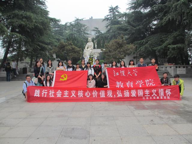 联合汉阳区团委开展“践行社会核价值观,弘扬爱国主义情怀”的清明祭奠活动,在王配才老师的带队下,学生党员来到了向警予烈士陵园,敬献鲜花,缅怀革命先烈,重温入党誓词。随后,集体参观晴川阁和大禹神话园以及长江大桥等历史文化景点,每到一处景点,都会由一名学生党员为大家进行介绍和解说,使同行的学生党员重温历史画面,重走革命先烈的足迹。