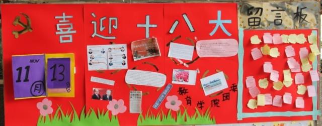 宣传板上的“喜迎十八大”专题主要分为两个部分,一个部分主要更新党的十八大召开的新闻,为向学生及时传达党的十八大召开的最新动态,让学生了解十八大召开的内容;另一部分是寄语板块,便利贴上的文字深深的表达了污漫